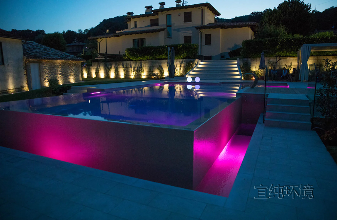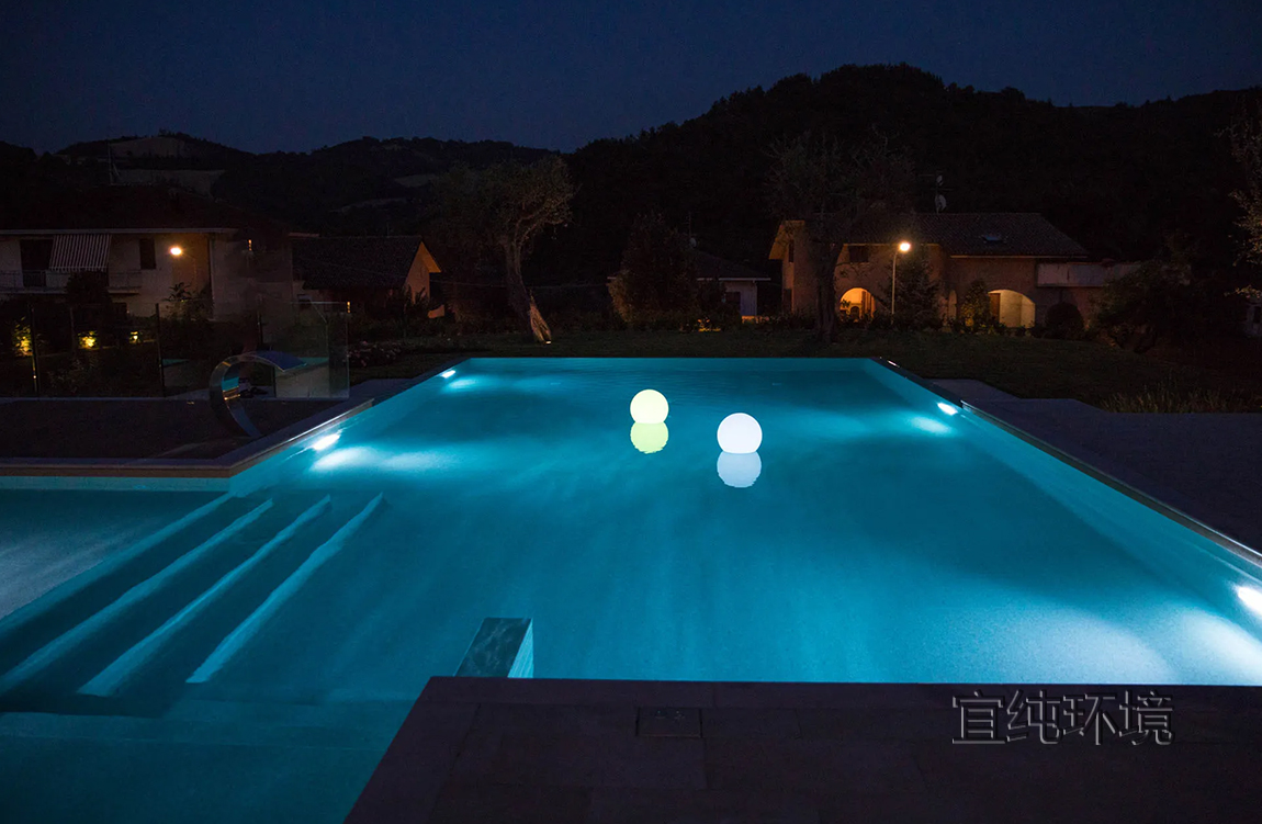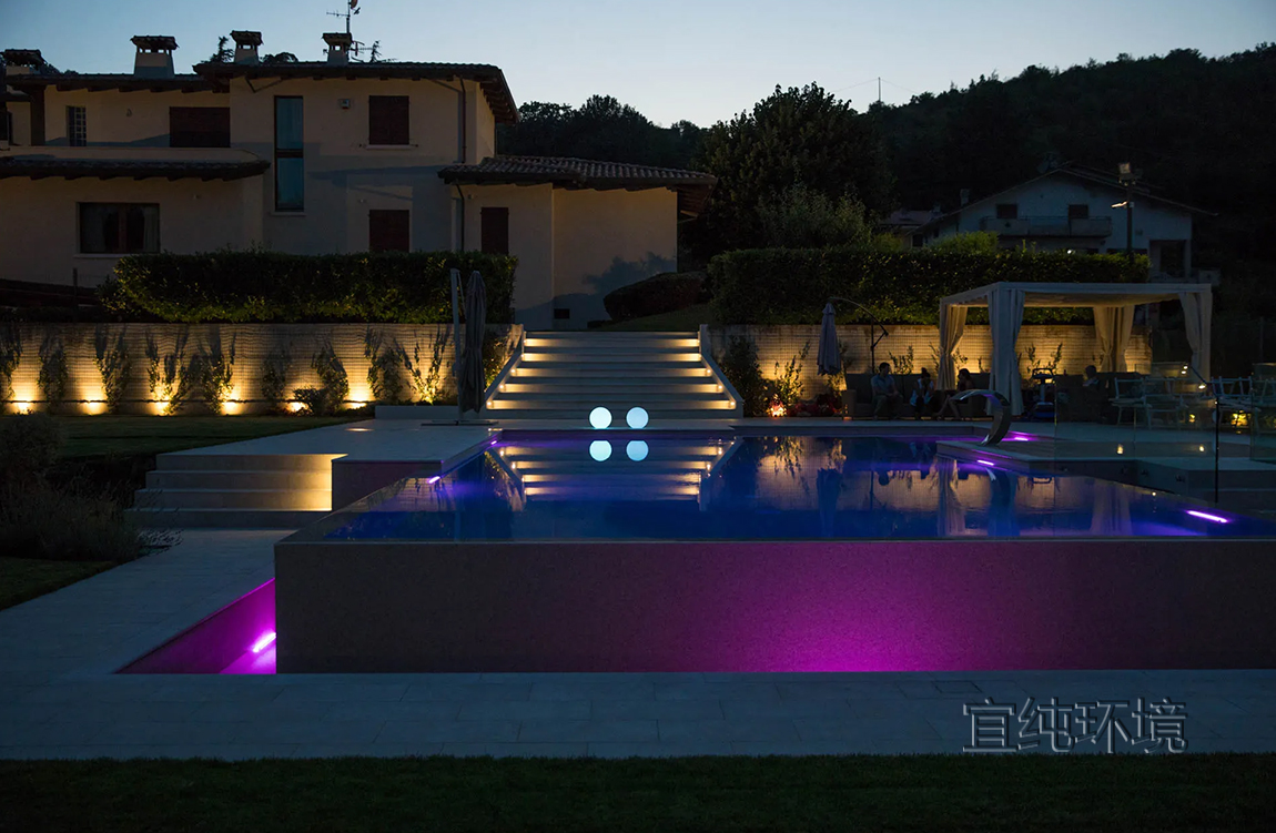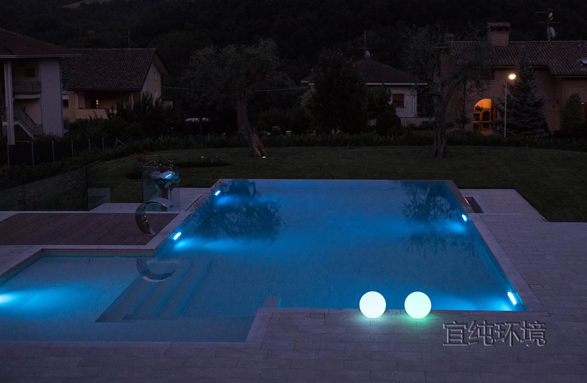 游泳池的灯光在傍晚营造出温馨的氛围。LED灯的反射,白光或彩色光,在水中呈现出令人惊叹的场景。