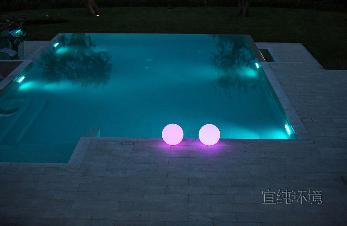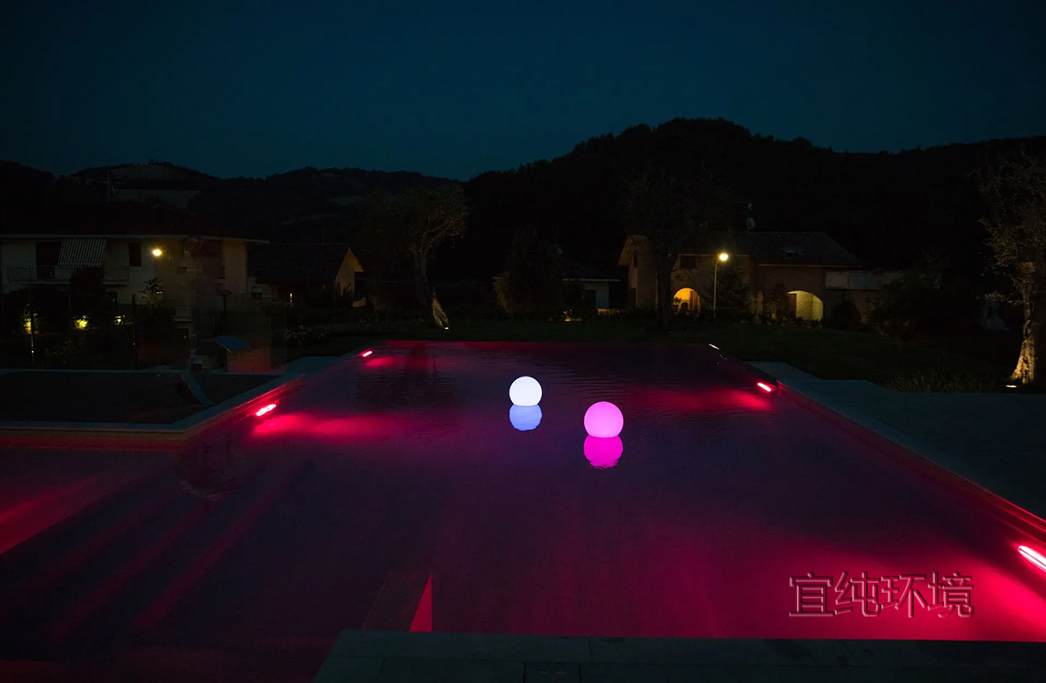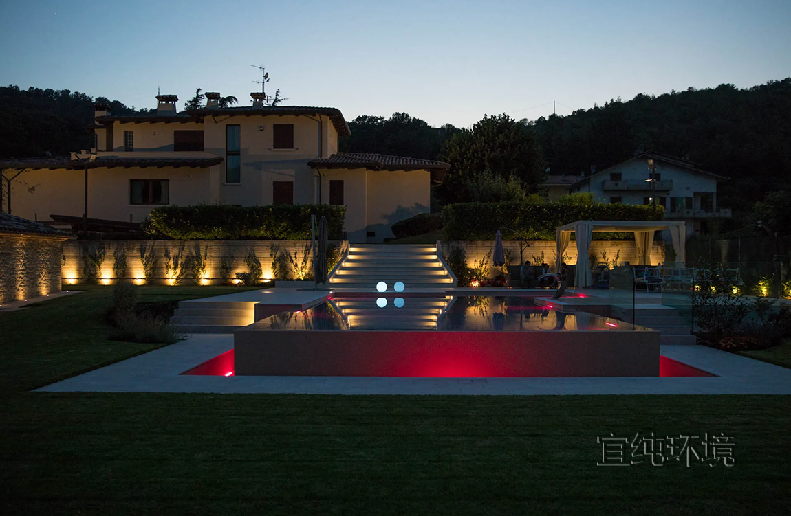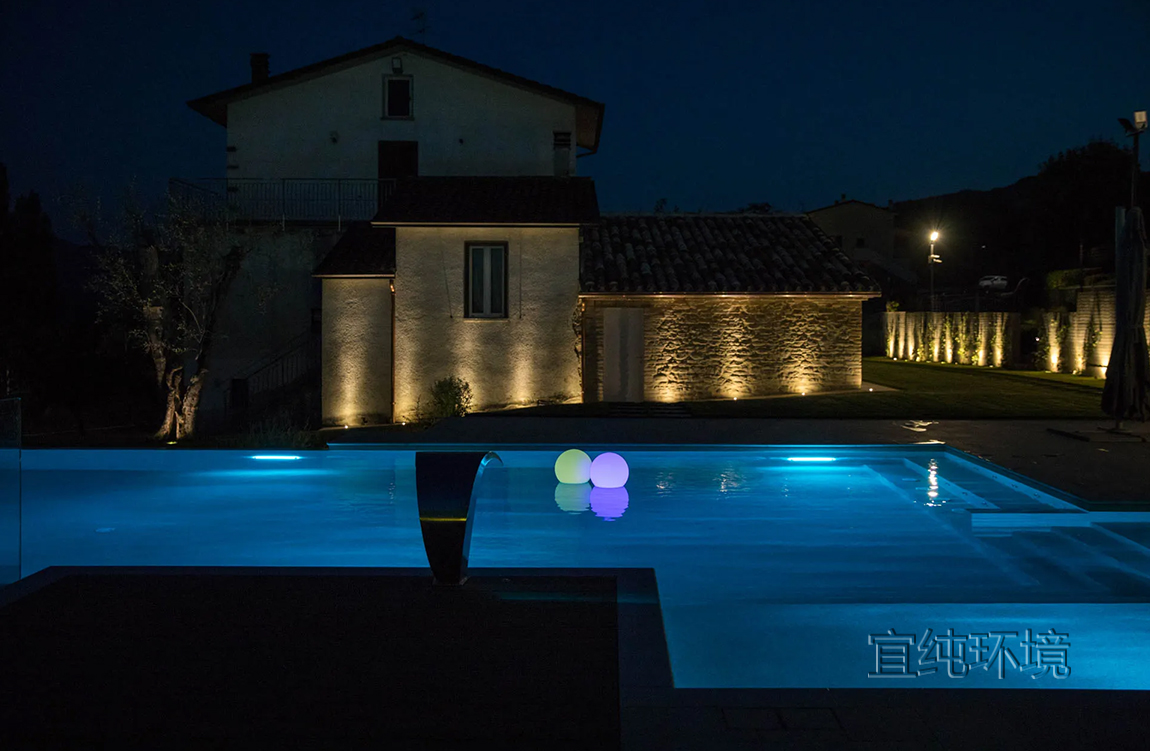 游泳池的灯光在傍晚营造出温馨的氛围。LED灯的反射,白光或彩色光,在水中呈现出令人惊叹的场景。