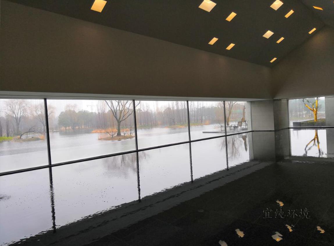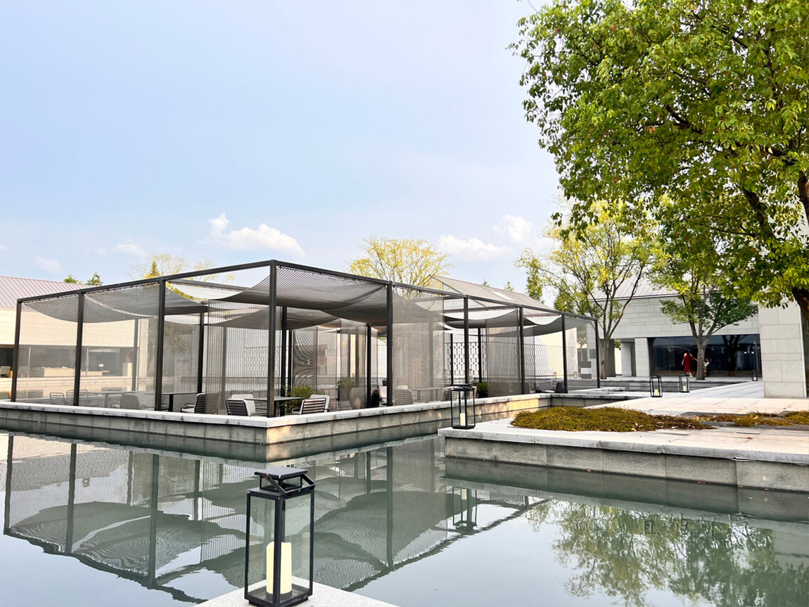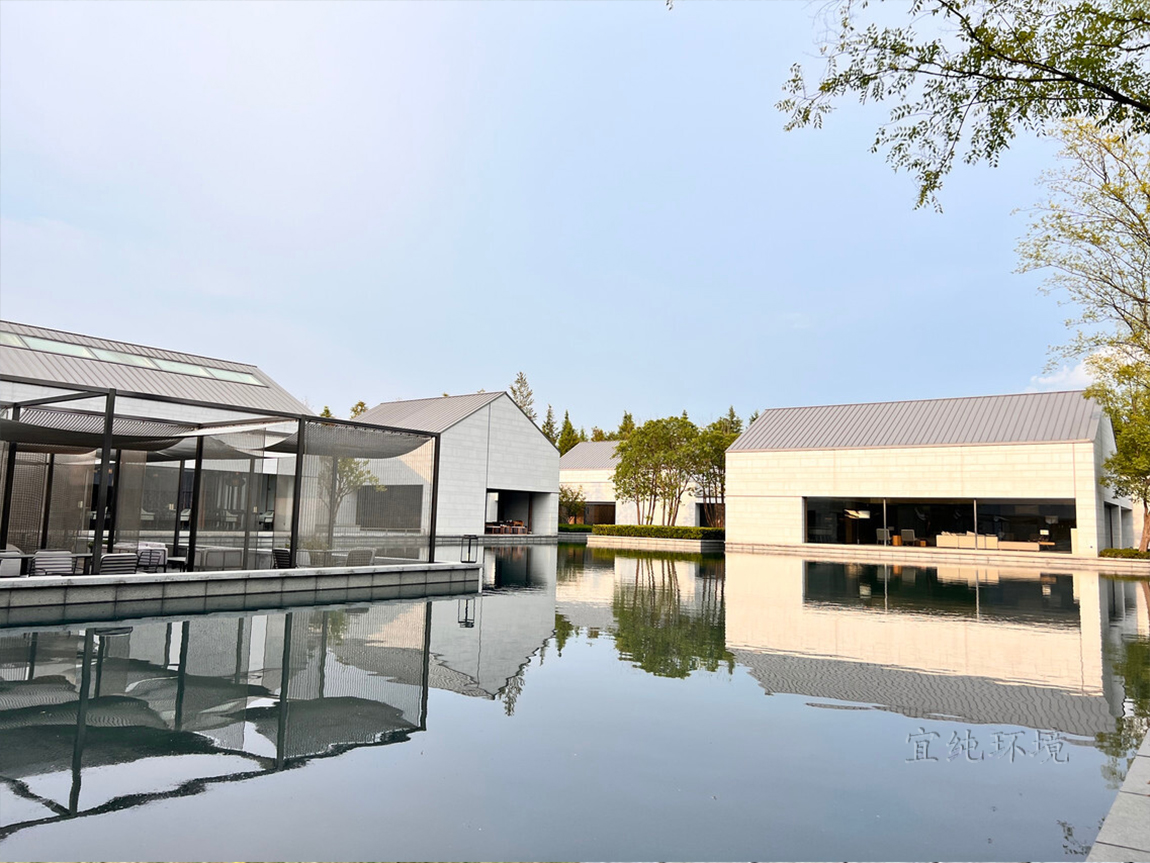 酒店拥有240平方米室内恒温泳池和室外180平方米户外无边泳池。亮点是室内泳池的光影设计,散落在屋顶亦疏亦密的孔洞。泳池三面均是落地玻璃设计,畅游间亦可观赏广阔的自然湿地景观及栖息的水鸟。泳池别墅以现代解构主义手法演绎传统中式大宅,宽敞的室内空间与明亮的室外空间相通,景从窗入。